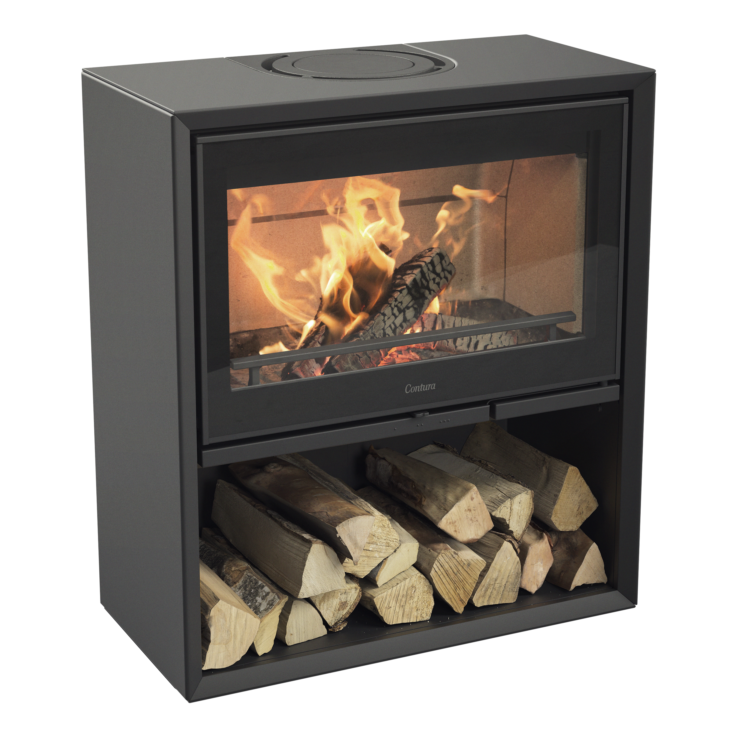 Den generösa luckan i glas ger elden en fin inramning. Luckan ger ett modernt intryck och är lätt att öppna med handtag som inte blir varma vid eldning. Braskaminen Contura 310G finns i svart eller vitt och kan kombineras med matchande, fristående vedförvaring. Vinnare av iF Design Award 2019.